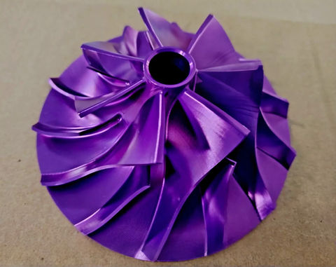 Machining complex parts such as these is managed using advanced point milling on a 7-axis CNC. Client had also requested anodizing to different colors. Due to the high RPM application, we ensured perfect balance of the compressor wheels by performing dynamic balancing services, complete with reports for each unit produced.